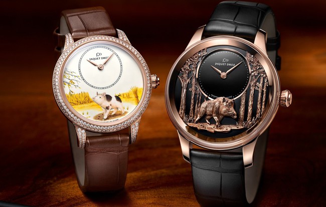 Jaquet Droz tung ra hai thiết kế khác nhau cho chiếc đồng hồ kỷ niệm năm mới. Chiếc đồng hồ này được trang trí bằng một bức tranh thu nhỏ của một chú heo con đang dạo chơi giữa cánh đồng, khắc hoạ niềm vui , sự ấm no trong năm mới.