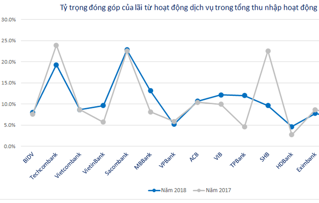 Chỉ có 16/24 ngân hàng cải thiện được tỷ trọng này trong năm vừa qua và tỷ lệ phổ biến chủ yếu từ 4-8%. Một số ngân hàng nổi bật hơn về việc hoạt động dịch vụ đóng góp lớn cho tổng nhu nhập là Techcombank (tỷ trọng đóng góp 19%), Sacombank (23%), SHB (23%),…. Trong khi đó, tỷ lệ này lại đặc biệt thấp ở các ngân hàng nhỏ, như tại NCB là 2%, BacABank 3,7%, Saigonbank 5%,…Ngoài ra, 2 công ty như VPBank và HDBank có chiến lược trọng tâm vào cho vay tiêu dùng cũng có tỷ trọng đóng góp của dịch vụ khá thấp, chỉ ở mức xấp xỉ 5%.