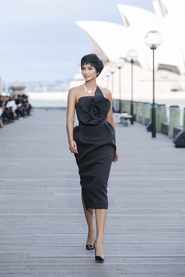 H’Hen Niê giữ vai trò mở màn cho show diễn lần này của Đỗ Mạnh Cường. Hoa hậu Hoàn vũ Việt Nam 2017 diện thiết kế ôm sát khoe đường cong tinh tế với điểm nhấn là phần hoa được dựng phom 3D to bản ở ngực. Màu da nâu bóng khỏe khoắn của người đẹp kết hợp với sắc đen của trang phục và trang sức ngọc trai sang trọng tạo nên một tổng thể vô cùng bắt mắt. Những sải bước đầy năng lượng nhưng vẫn ngọt ngào của H’Hen Niê đủ khiến người xem thích thú.