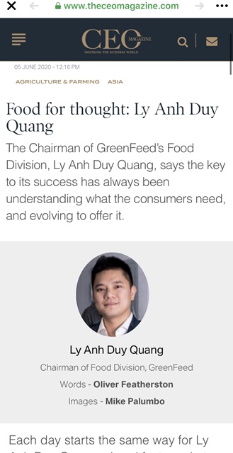 Tập đoàn GreenFeed được Forbes Việt Nam vinh danh trong Top 50 thương hiệu dẫn đầu trong các lĩnh vực kinh doanh tại Việt Nam năm 2020. Mới đây, anh Lý Anh Duy Quang, chủ tịch Ngành Thực Phẩm Công ty GreenFeed cũng vừa được báo Úc phỏng vấn để chia sẻ về cuộc sống và công việc điều hành doanh nghiệp.